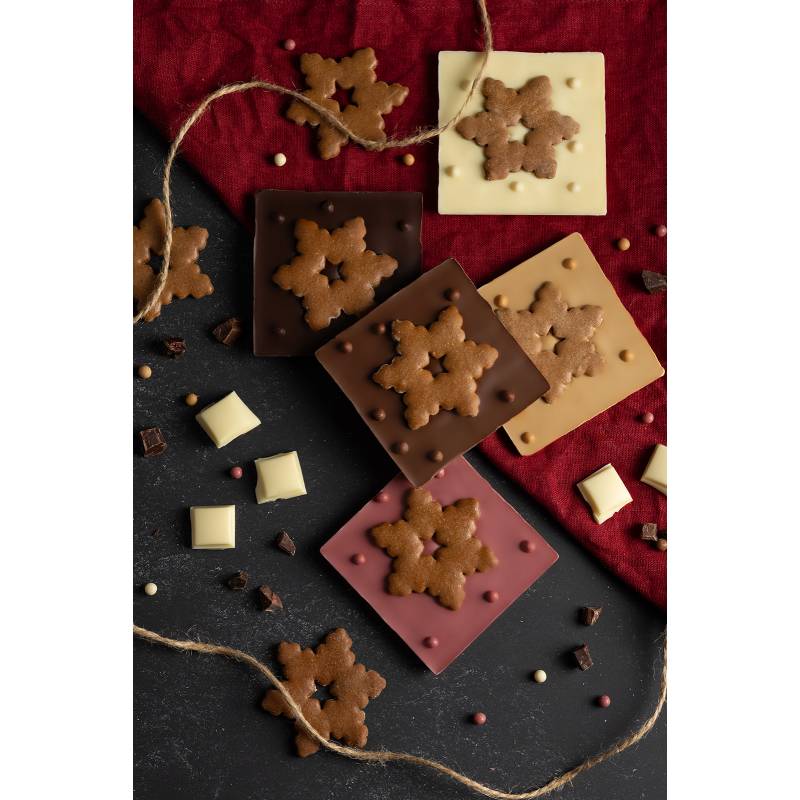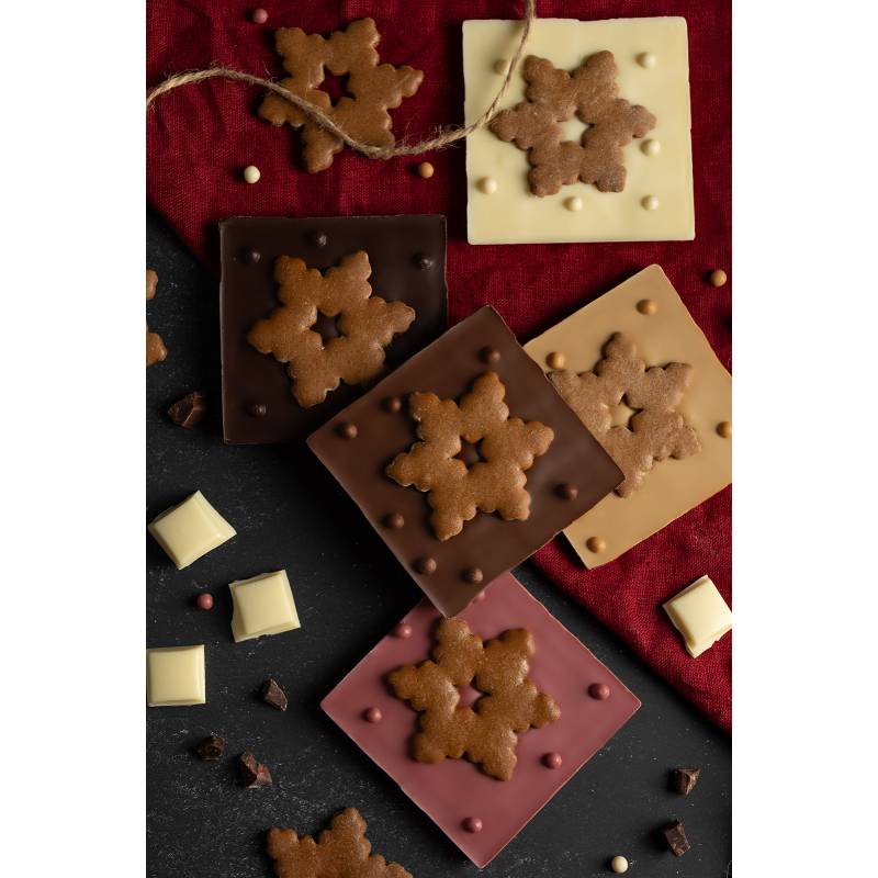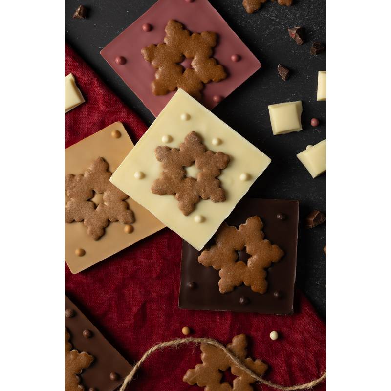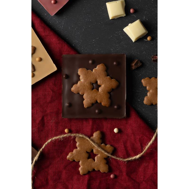 Tabliczka czekolady z zatopioną piernikową śnieżynką.