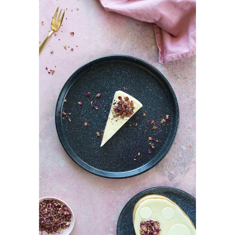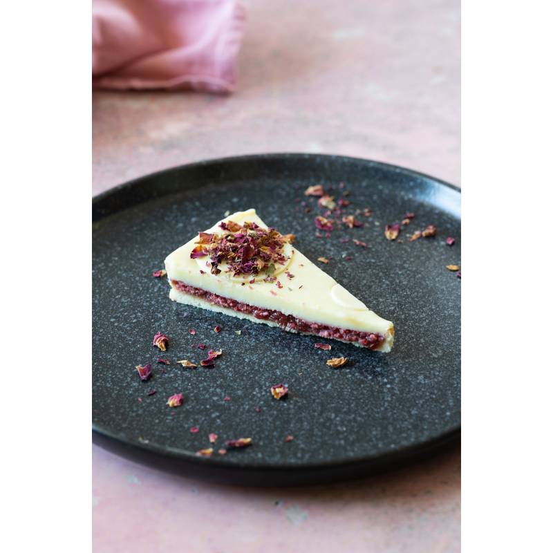 Kruche ciasto maślane, chrupiącą warstwa migdałów, malin liofilizowanych i czekolady rubinowej, konfitura z płatków róż własnej produkcji, ganasz z białej czekolady z wodą różaną.