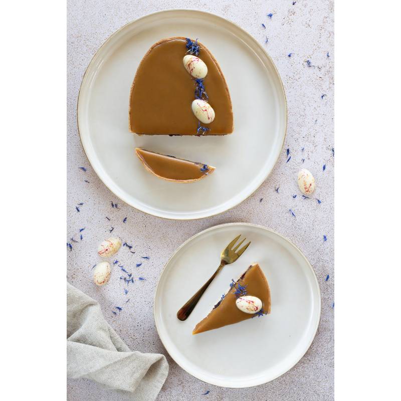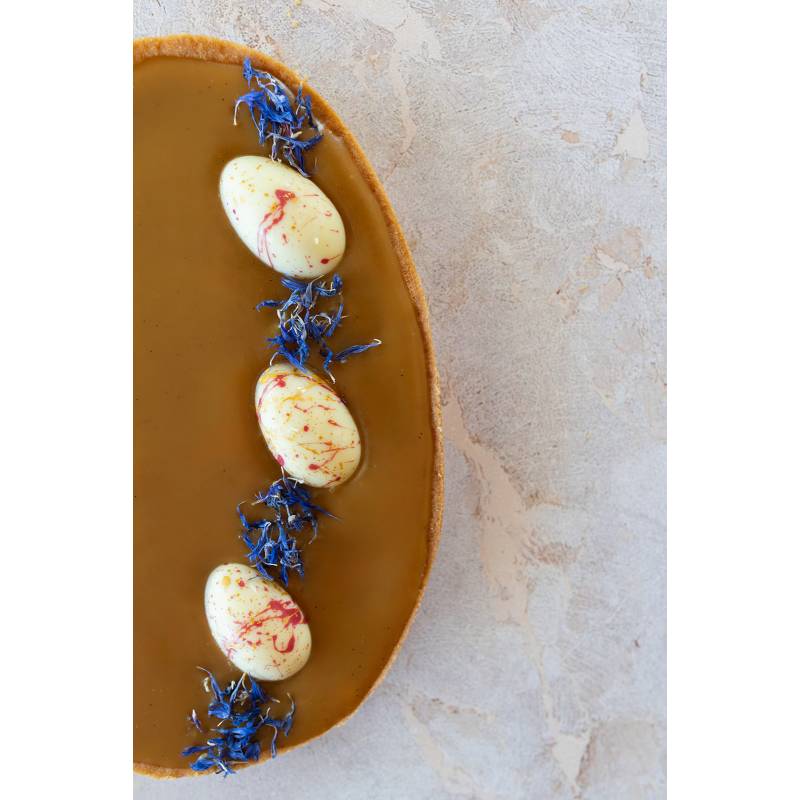Waga: 400 g Wielkość: 13 cm x 18,5 cm Kruche ciasto maślane, chrupiąca prażynka (migdały, mleczna czekolada, orzech laskowy), ganasz z belgijskiej czekolady.MAZURKI WYSYŁAMY W DNIACH 31.03.-01.04.