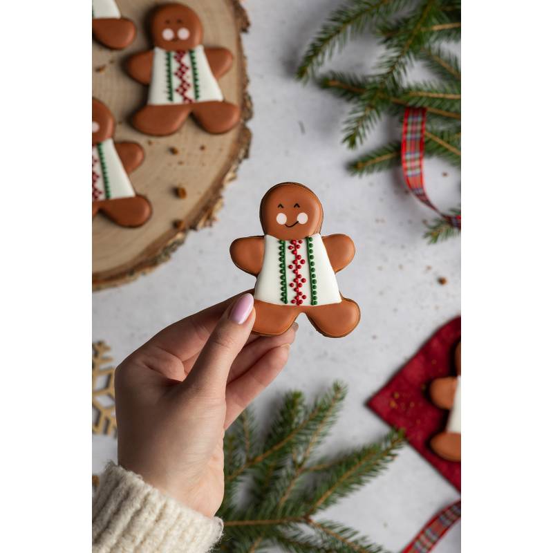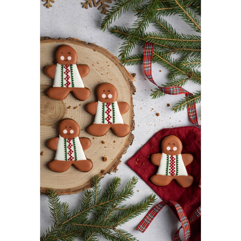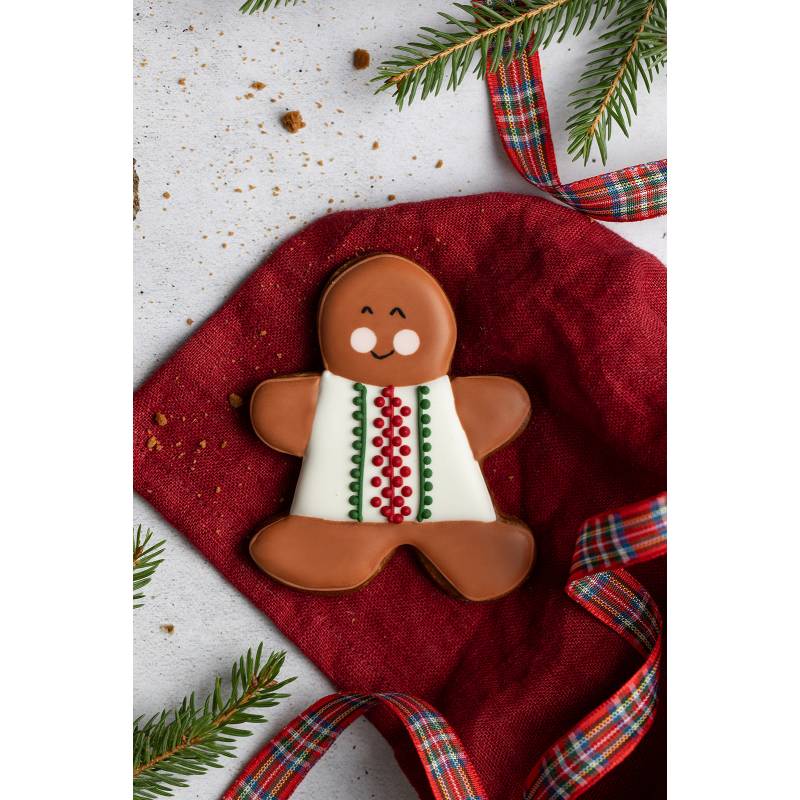 Skład: mąka pszenna (gluten), miód pszczeli, cukier, masło (mleko), ciemna czekolada (masa kakaowa, emulgator (lecytyna sojowa, aromat naturalny (wanilia), woda, przyprawa piernikowa (imbir, kolendra, goździki, cynamon, ziele angielskie, kakao) substancja spulchniająca (difosforan sodu, węglan sodu), mąka pszenna (gluten), cukier puder (sacharoza, glukoza), białko jaja, sok z cytryny, barwniki: brązowy- karmel; czerwony, różowy- karmina, zielony- chlorofilina,
