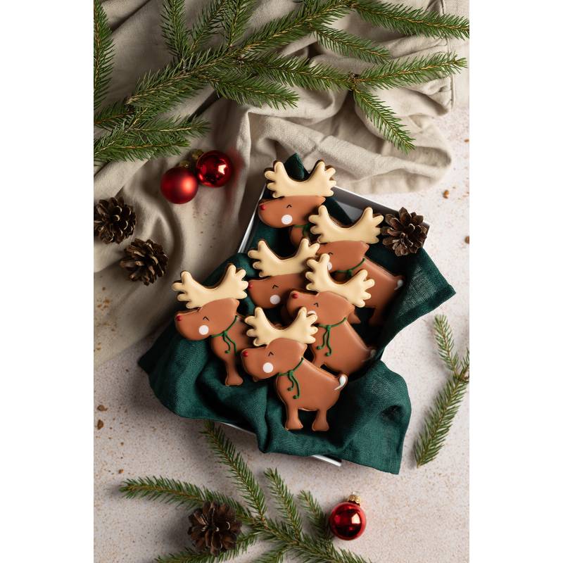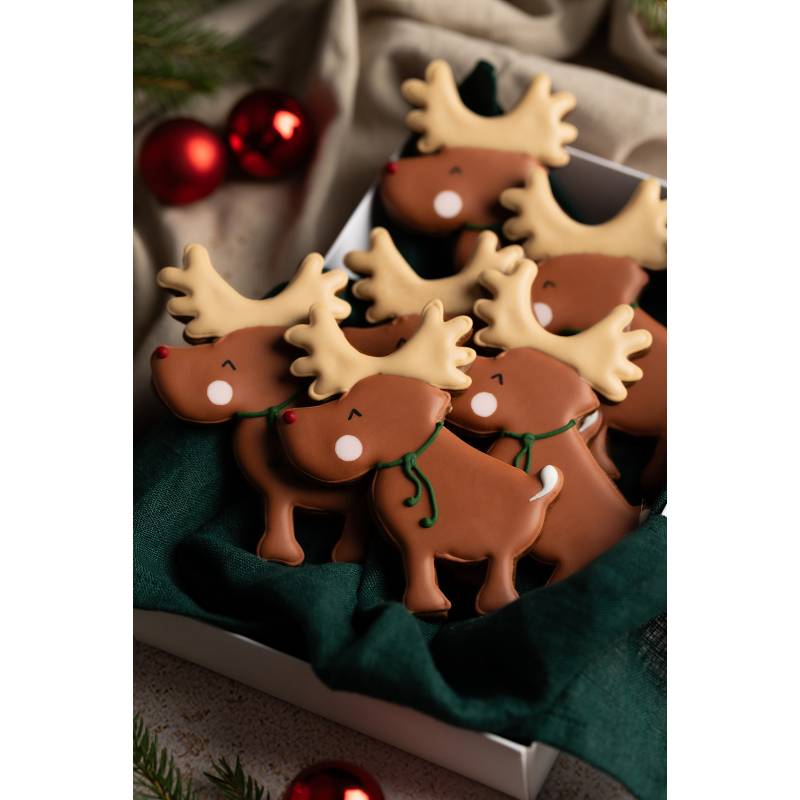Skład: mąka pszenna (gluten), miód pszczeli, cukier, masło (mleko), ciemna czekolada (masa kakaowa, emulgator (lecytyna sojowa, aromat naturalny (wanilia), woda, przyprawa piernikowa (imbir, kolendra, goździki, cynamon, ziele angielskie, kakao) substancja spulchniająca (difosforan sodu, węglan sodu), mąka pszenna (gluten), cukier puder (sacharoza, glukoza), białko jaja, sok z cytryny, barwniki: zielony- chlorofilina, czerwony- karmina, brązowy- karmel.