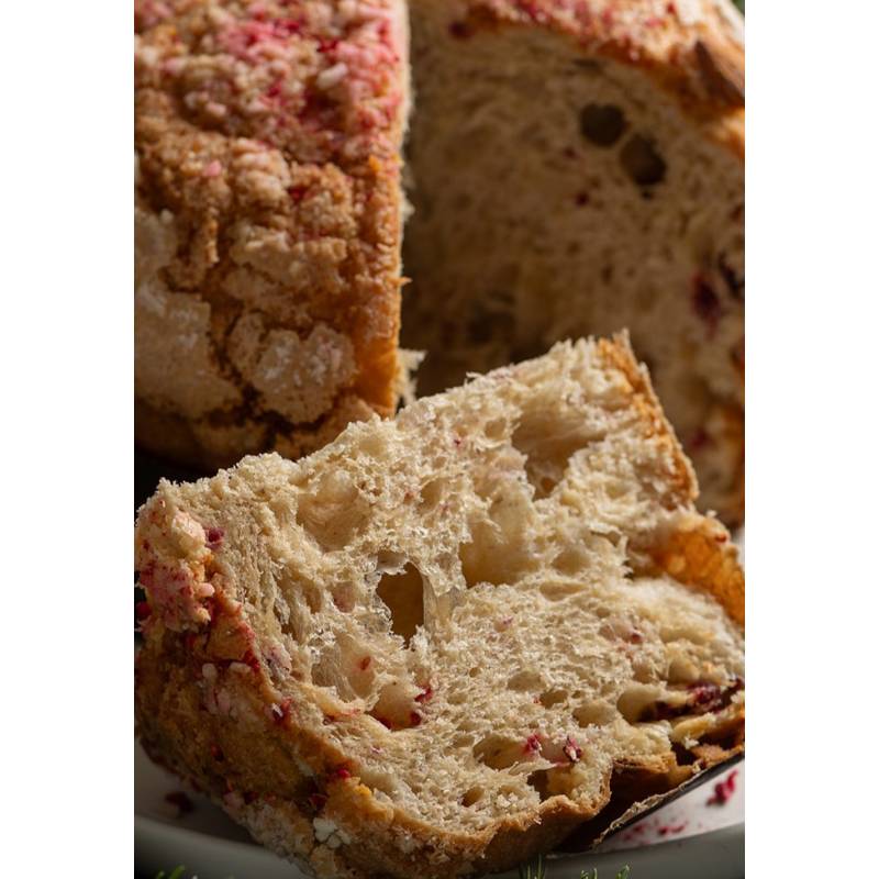 Składniki: mąka PSZENNA typ 00, MASŁO, biała czekolada (cukier, tłuszcz kakaowy, MLEKO pełne w proszku, emulgator: lecytyna SOJOWA, naturalny aromat waniliowy),żółtka JAJ, woda, naturalny zakwas PSZENNY, ŚMIETANKA 36%, miód naturalny, maliny liofilizowane, sól, MIGDAŁY, białka JAJ, skrobia kukurydziana, naturalna wanilia.